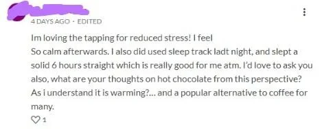 “Im loving the tapping for reduced stress! I feel So calm afterwards. I also did sleep track last night, and slept a solid 6 hours straight which is really good for me atm. I’d love to ask you also,what are your thoughts on hot chocolate from this perspective? As I understand it is warming?…and a popular alternative to coffee for many.”